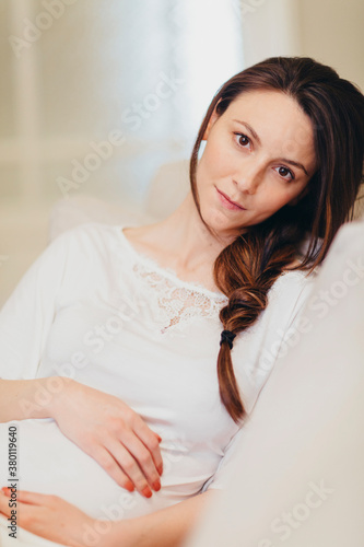 rest, pregnant, anticipation, home, beautiful, braid, brunette, care, cheerfulness, closeup, couch, cushy, hugs, expect, forecasting, fresh, hand, hold, indoor, lean, massage, mother, motherhood, portrait, pregnancy, recline, relaxed, serene, to sit, smiling, snug, sofa, touch, waiting, woman, young, real people, baby face, caucasian, white, girl, female, person, people, adult, adult, 20s, grown-up