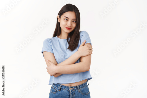Tender feminine romantic silly asian girl dark short hairstyle touch own body hugging cross arms tenderness lovely pose smiling caring relaxed camera standing white background delighted