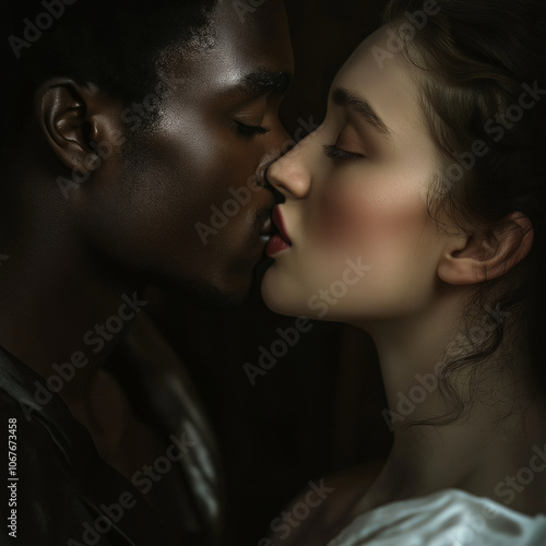 people, man, woman, male, female, black, white, ethnicity, culture, embracing, hugs, tender, kiss, kissing, love, intimacy, affection, beauty, hair, 2, together, romance, romantic, sensuality, passion, lip, face, closeup, portrait, sensual, eye, closed, valentine, lover, couple, human relationships, illustration, artistic, art, realistic, realism, photorealistic, background, banner, wallpaper, poster, card