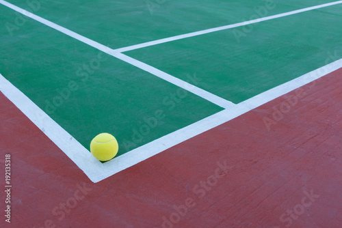 tennis ball just inside of the corner of a hard court