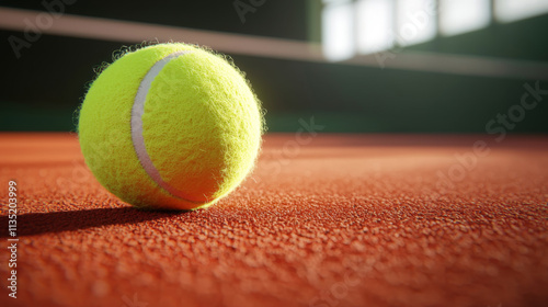 Tennis ball rolling on clay court indoor sports arena close-up shot dramatic lighting