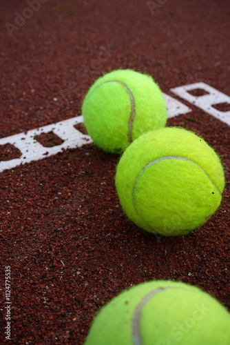 Tennis Balls on Clay Court. Several bright green tennis balls lie on a red-brown clay surface with markings. Perfect for sports-related themes.