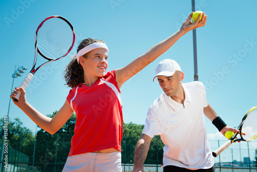 tennis, serving, teenage, smiling, junior, positive, explaining, coach, instructor, tennis player, sport, playing, professional sport, exercising, tennis court, training, practicing, outdoors, service, tennis ball, racket, people, lifestyle, athlete, equipment, sunlight, motion, little girl, competitive sport, healthy lifestyle, selective focus, sky, blue, white, two people, woman, man, young men, horizontal, photo