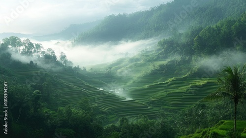 fog, horizontal, no people, color image, hill, morning, grass, nature, outdoors, rural scene, agriculture, asia, farm, mountain, plant, travel, tree, rice terrace, growth, photo, beauty, sky, environment, tour tourism, background, calmness, dreamy, land, meadow, misty, palm, soft, sunrise, twilight, vacation, vale, indonesia, photo, plantation, sunlight, bali, blank, culture, dramatic sky, exoticism