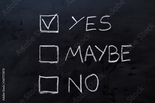 Test escrito en una pizarra a mano con las palabras sí, quizás o no