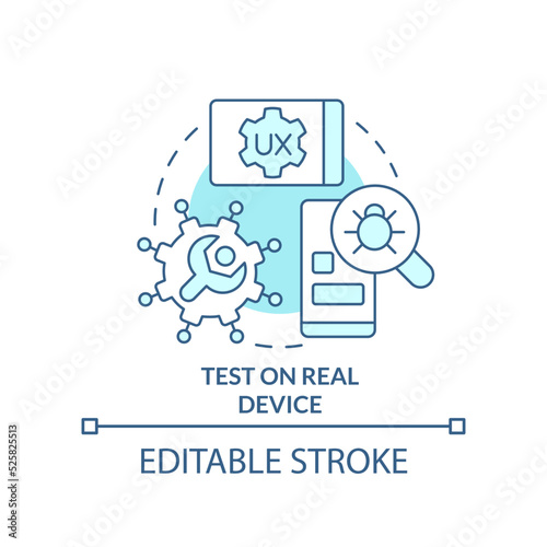 Test on real device turquoise concept icon. Mobile first design process abstract idea thin line illustration. Isolated outline drawing. Editable stroke. Arial, Myriad Pro-Bold fonts used