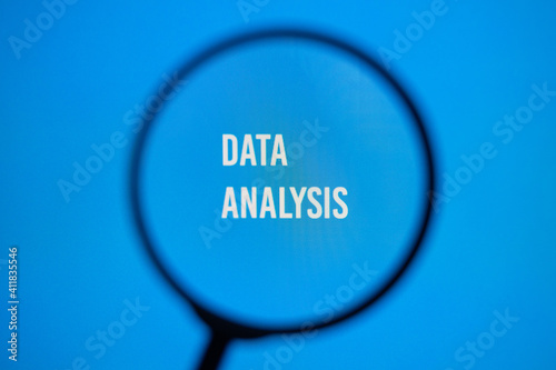 Text data analysis on blue screen through magnifying glass.