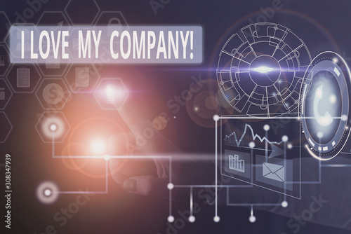 Text sign showing I Love My Company. Business photo showcasing tell why admire their job and workplace Picture photo system network scheme modern technology smart device