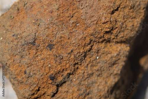 Texture of a rough rock showing orange and brown mineral details under natural light in an outdoor setting