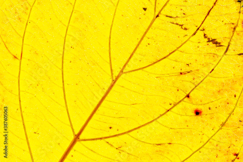 Texture of a yellow colorful autumn leaf use as natural abstract background. Cell structure. Detail nature.