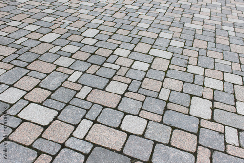 Texture of pathway pavement covered with rock bricks.