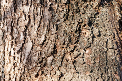 Textured bark of a deciduous tree, close-up, on a spring day.