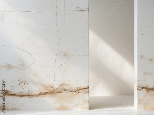 Textured White Wall with Cracks and Fading, Minimalist Interior Architecture.