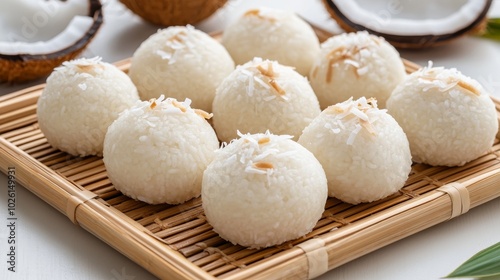 Thai coconut rice balls small soft coconut rice balls filled with sweet shredded coconut and sugar served on a woven bamboo tray with coconut shavings sprinkled on top