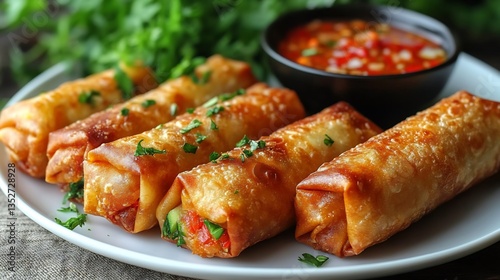 Thai spring rolls vegetables and dipping sauce served on a white plate isolated a light and crunchy Thai appetizer