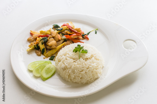 Thai stir fried chicken and basil with rice or " Khao Pad Kra Pr
