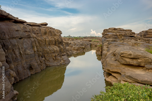 Thailand grand canyon (sam phan bok) at Ubon Ratchathani, Thailand. Beautiful landscape of holes and rock mountain with river.