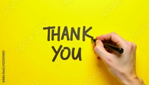 Thank You Message, Handwritten on Yellow Background, Hand with Pen