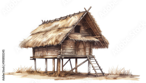 Thatched hut on stilts with a small window, isolated on a white background, with visible ground underneath cutout on alpha channel
