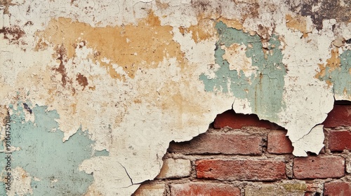 The aged wall displays a fascinating texture of cracked paint, revealing layers of color and underlying bricks