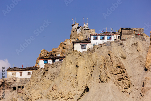 The ancient Buddhist monastery in the village of Dhankar on a barren cliff in the Spiti Valley in Himachal Pradesh, India.