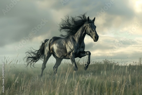 The artwork features a horse in full stride, racing through a verdant field, embodying energy and the spirit of the wild, A majestic horse galloping across a meadow, AI generated