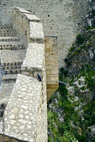 The atmosphere of a medieval fortification: a crow sitting on a crenellated defensive wall. Visiting the Golubac Fortress, Serbia: view of a stone wall connecting towers 3 and 4. A bird in the castle