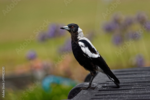 The Australian magpie (Gymnorhina tibicen) is a medium-sized black and white passerine bird native to Australia and southern New Guinea. Bird in the rain