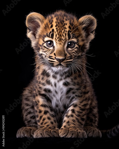 the baby African Leopard, portrait view, white copy space on right, Isolated on black Background