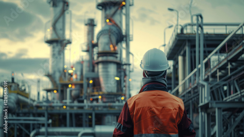The back of an engineer wearing a safety helmet and vest, standing in front of a gas plant with metal pipes, in an industrial area at an oil production facility.