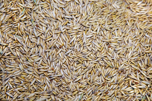 The background of oat grains of an oblong elongated shape is yellow. Agriculture cereals backgrounds.