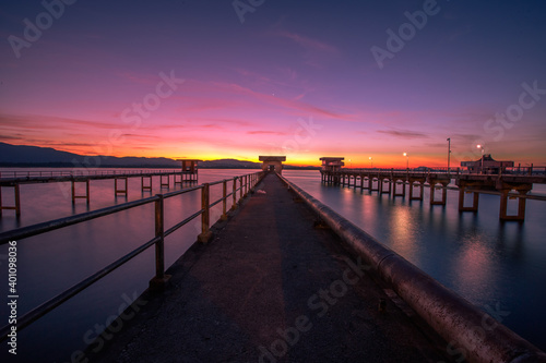 sunset, pier, sea, water, beach, bridge, sky, sunrise, breakwater, landscape, ocean, lake, nature, sun, summer, coast, calm, cloud, horizon, blue, wooden, wood, orange, travel, morning
