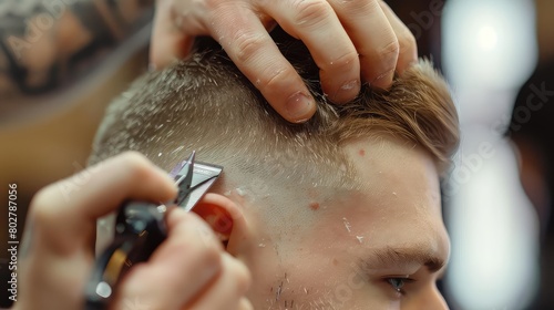 The barber using clippers to neatly shape the sides of the young man's hair.