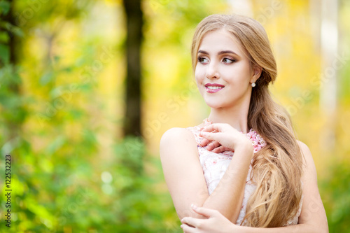 The beautiful gentle girl in the autumn forest in the afternoon. Girl autumn