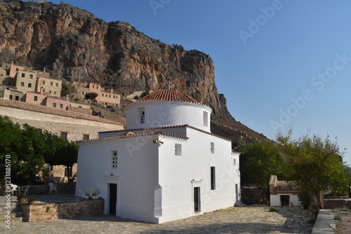 The beautiful old walled fortress town of Monemvasia in Greece overlooking the Mediterranean Sea