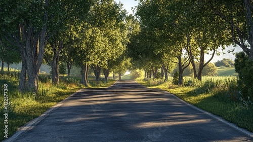 The beautiful rural asphalt road shadowed with the poplar trees. HD Realistic.