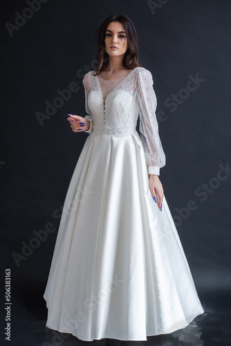 dress, bride, woman, wedding, beauty, fashion, model, gown, person, hair, elegance, glamour, posing, lady, bridal, long, people, studio, elegant, style, face, brunette, 1, gorgeous, black