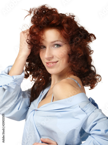 adult, attractive, beautiful, beauty, blue, clothing, expression, face, fashion, female, girl, glamour, hair, happiness, happy, healthy, isolated, lady, lifestyle, model, modern, morning, peaceful, people, person, relax, relaxation, sexy, shirt, smile, arousing, waking, woman, woman, young, red-haired, ginger