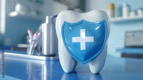 The blue shield with a white cross on it, positioned on the tooth. Dental icon wallpaper