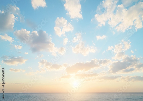The blue sky is covered with white clouds and the sun sets on the sea surface. The sky's color gradient gradually changes from light yellow to deep orange. A few thin and large cotton candy.