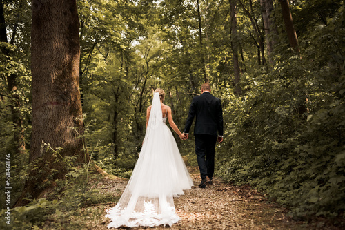 The bride and groom hold hands and look to the future in the middle of nature, the newlyweds walk together,wedding photography,until death do us part