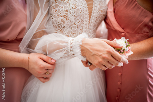 THE BRIDE IN A WEDDING DRESS WITH A RING ON HIS HAND