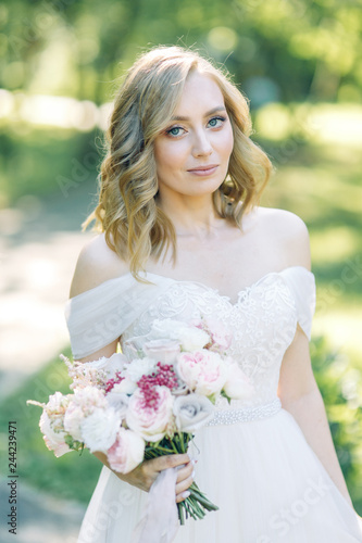 The bride in a white dress in nature in the Park. Photo shoot with a bouquet in the style of fine art.