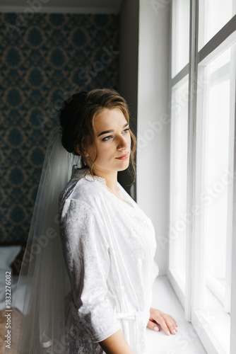 The bride in a white robe stands by the window holding a cup of coffee. She smiles softly, enjoying a calm moment before the wedding. A warm and peaceful morning atmosphere in a cozy room.