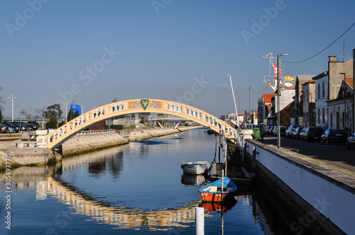 The bridge through the water channel is reflected in the water. Little boat on the water. Aveiro. Portugal. Europe.
