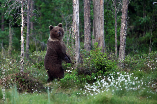 The brown bear (Ursus arctos) female in the forest. A young bear in the finnish taiga.The bear stands in the woods and looks around.