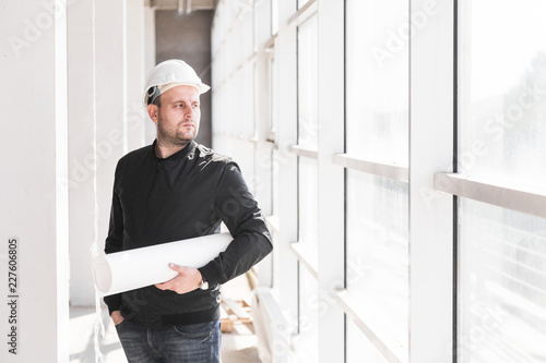 the builder architect in a helmet with drawings is working at the construction site. supervision of construction. bargain, apartment purchase, real estate