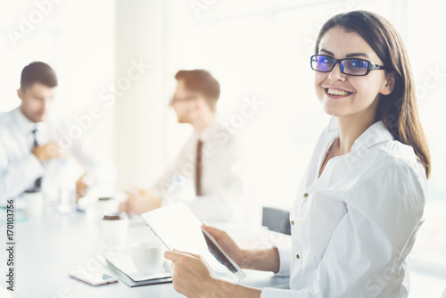 table, people, business, modern, meeting, man, suit, to sit, room, light, office, group, teamwork, team, indoor, corporate, professional, conference, work, job, colleague, success, contemporary, smile, manager, men at work, smart, clever, hand, look, goggles, hold, accent, sharpened, businesswoman, lady, happy, three, woman, sunny, blur, face, portrait, screen, pad, tablet, online, glare