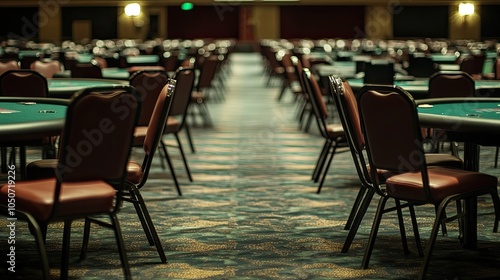 The calm of an empty casino floor, where rows of poker and blackjack tables sit in perfect order, ready for play but void of people.