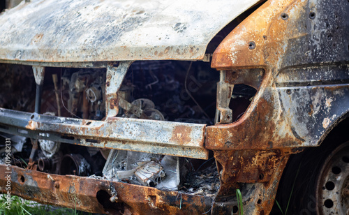 The car was completely destroyed by fire. Abandoned, burnt and rusty car by the road. Cars were on fire in the parking lot. War of Russia against Ukraine. Shrapnel and bullet holes in cars.